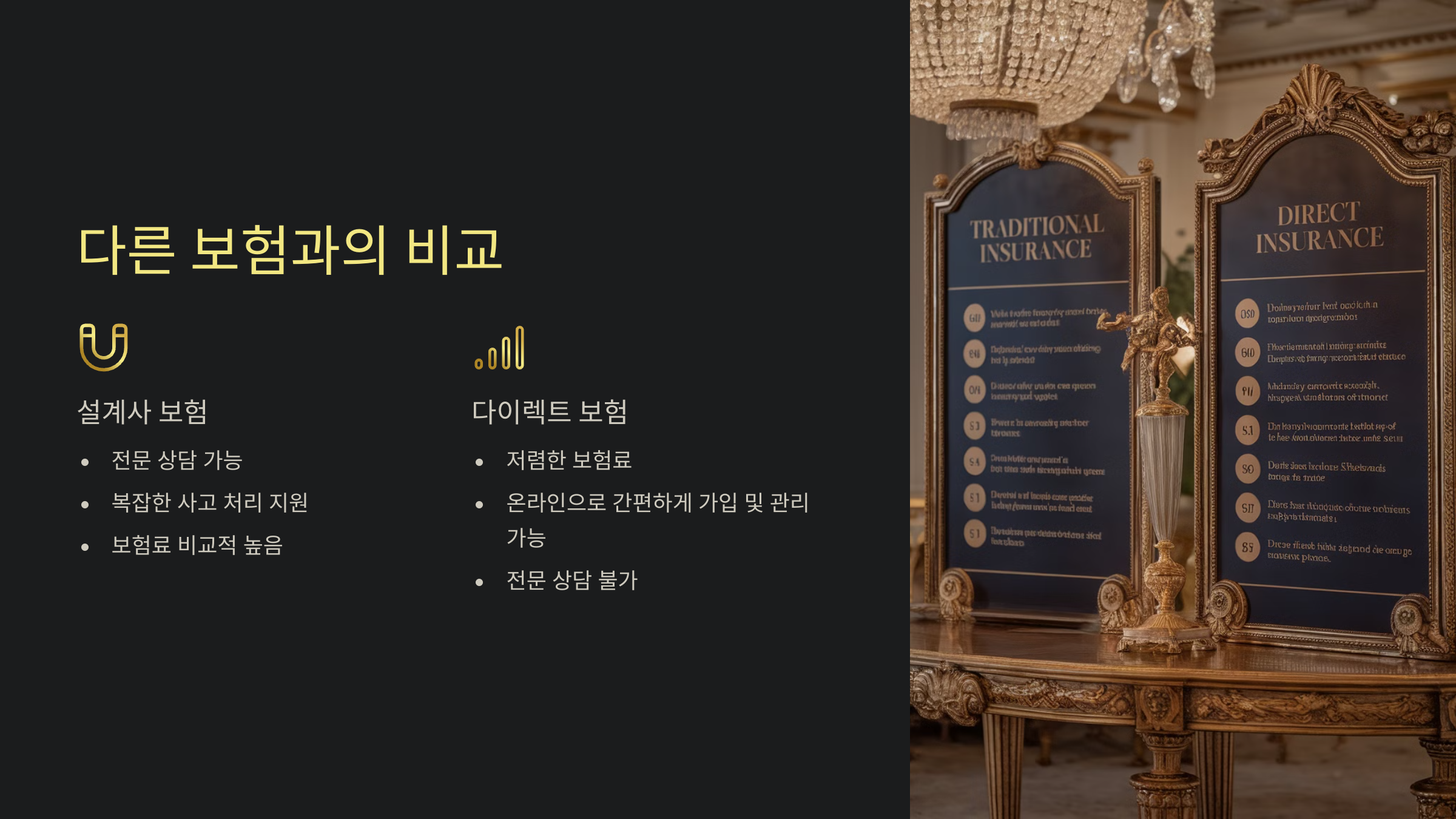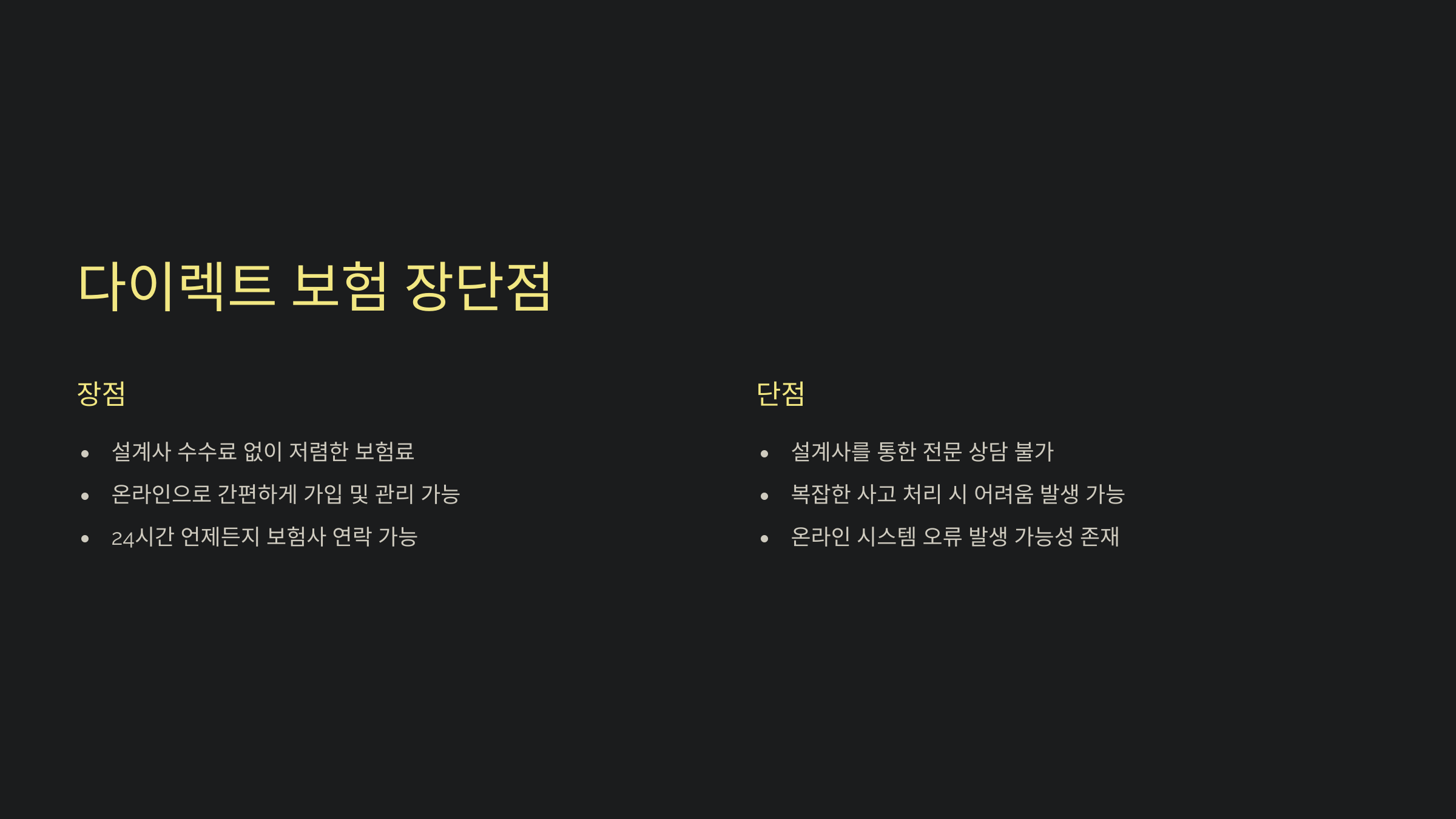 하지만 직접 상품을 비교하고 선택해야 하기 때문에 보험에 익숙하지 않은 사람들에게는 어려울 수 있어요. 대면 상담이 부족하다 보니 복잡한 사고 처리나 면책 사항 확인 과정에서 혼란이 생길 가능성도 있어요.