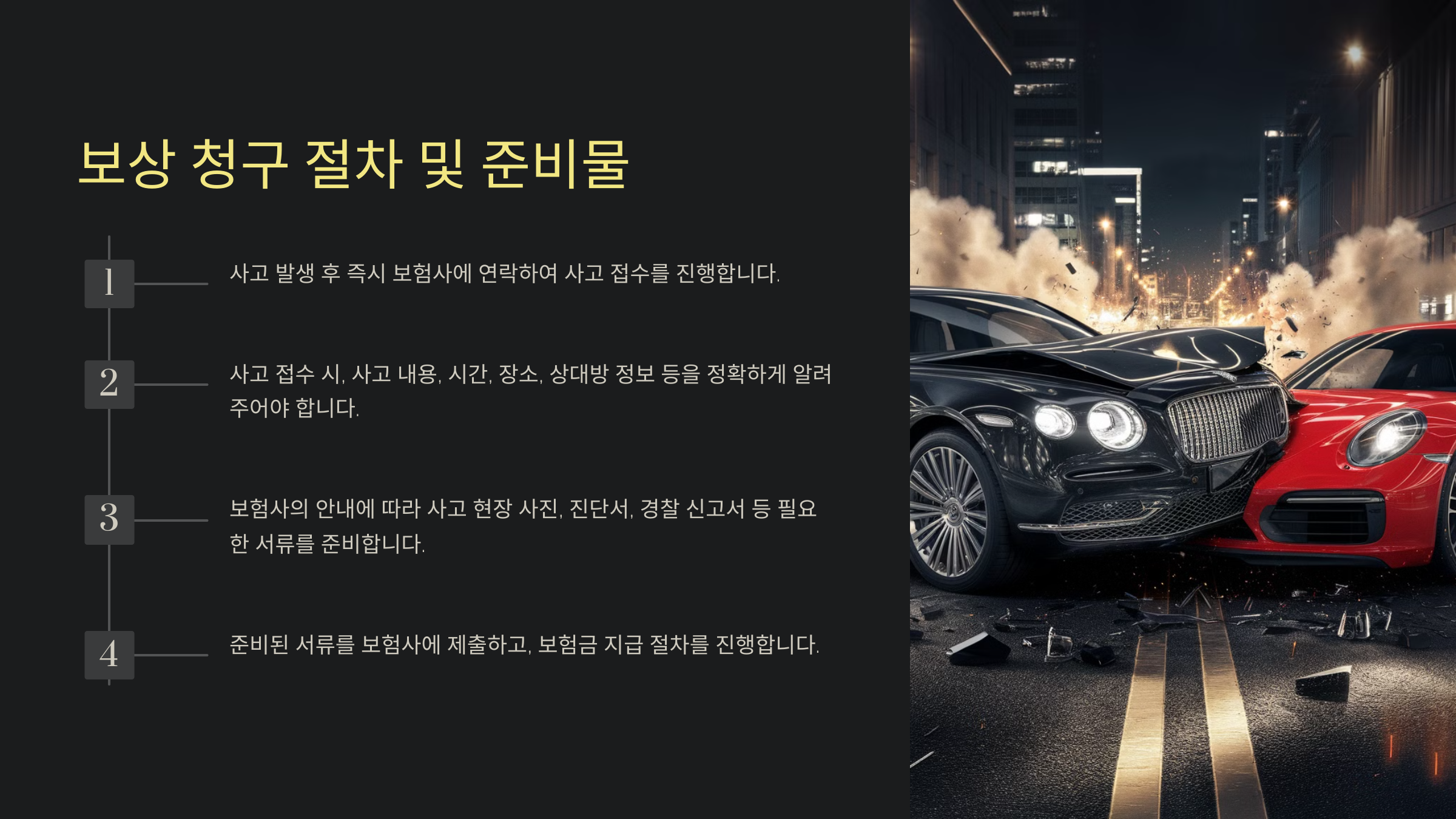 첫째, 사고 발생 직후 가능한 한 빨리 현장을 사진으로 기록하세요. 차량 파손 상태와 사고 위치를 명확히 찍어야 해요. 다른 차량이나 운전자와의 충돌 사고라면 상대 차량의 번호판과 손상 상태도 함께 기록해 두세요.