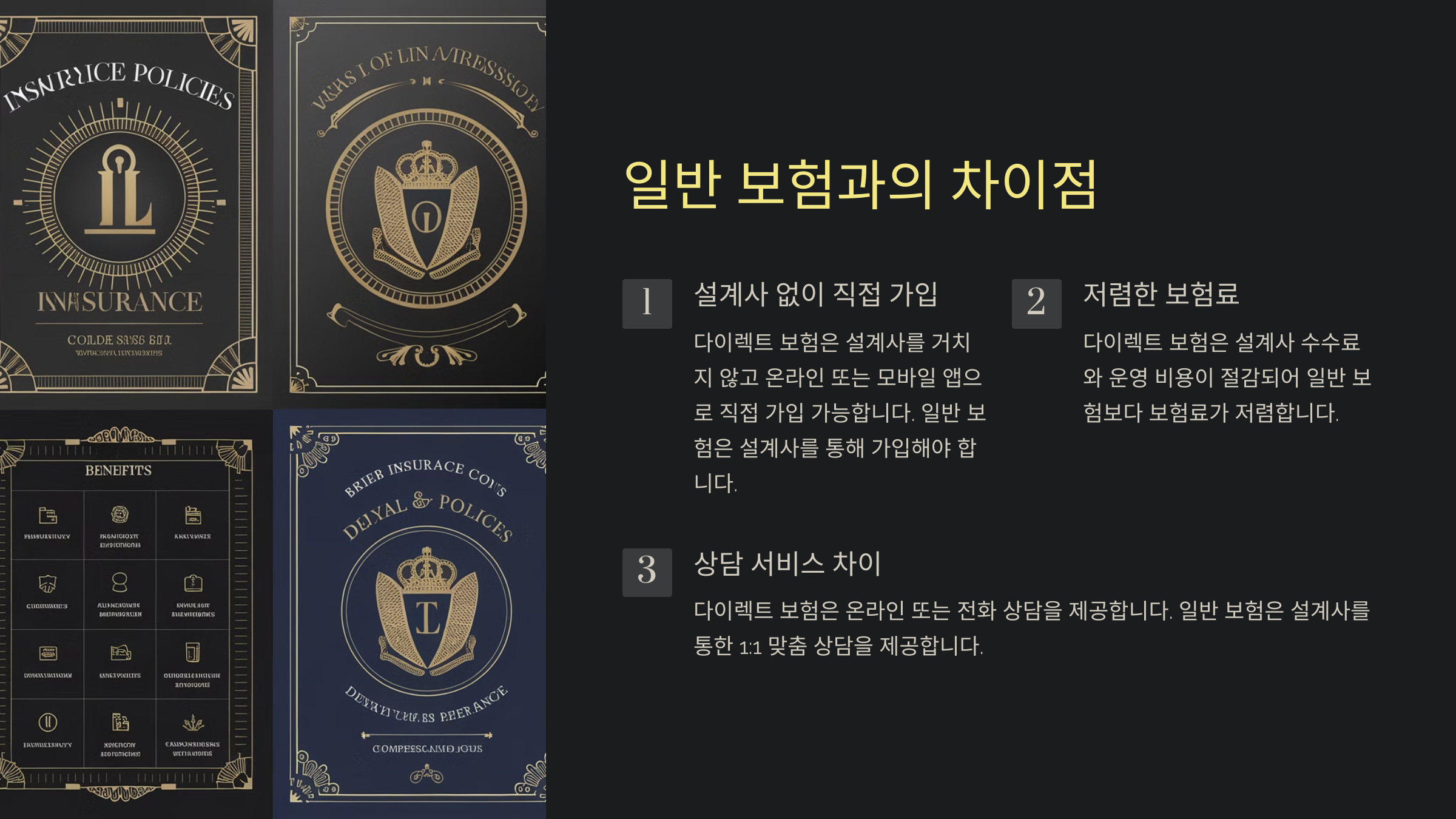 반면, 일반 보험은 설계사의 도움을 받아 필요한 정보를 얻거나 상품을 추천받는 장점이 있어요. 하지만 다이렉트 보험은 투명한 정보를 제공하며 고객이 직접 상품을 비교하고 선택할 수 있기 때문에 더 많은 자유와 선택권을 준다는 점이 강점이에요.