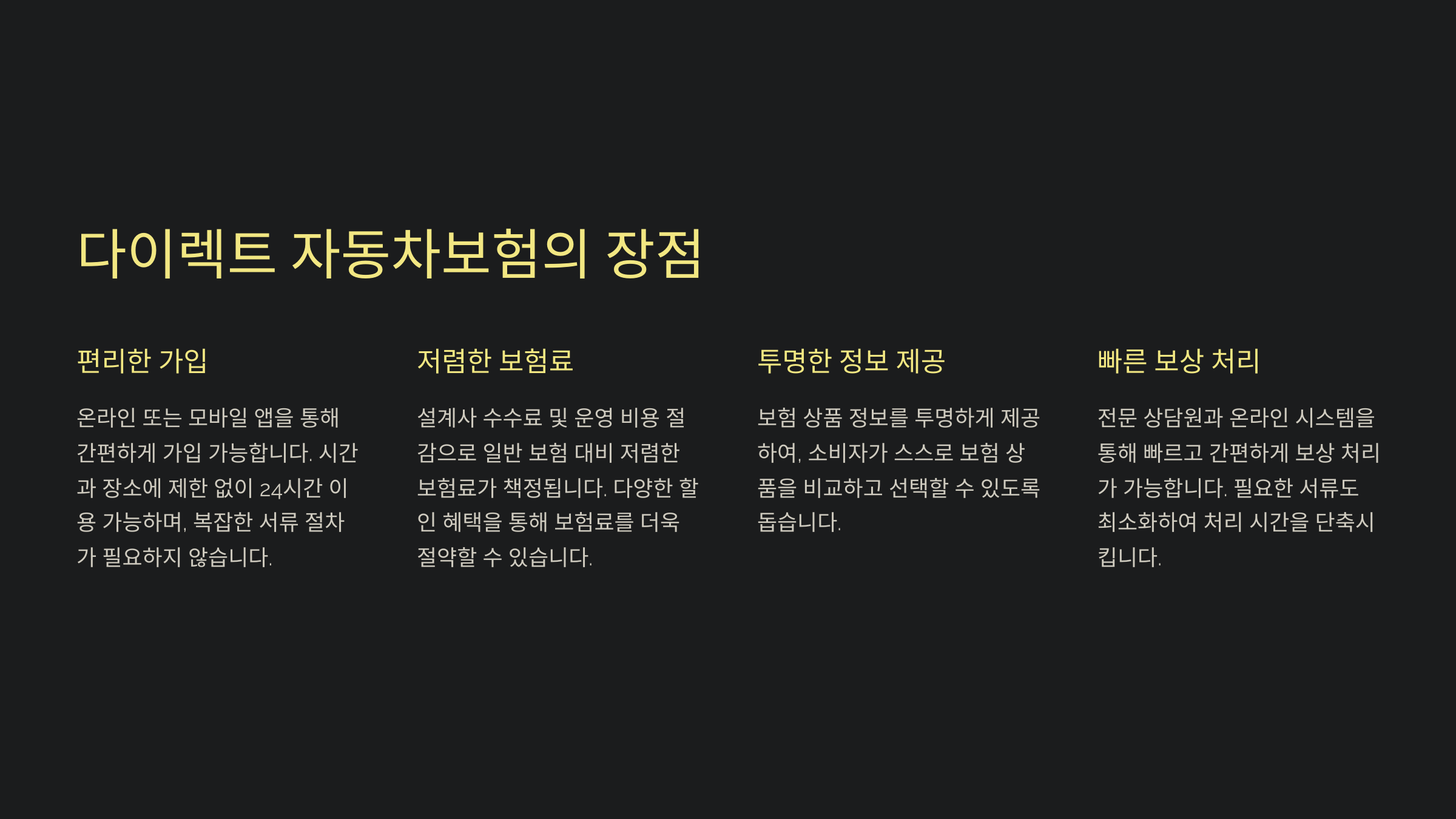 이러한 특징 덕분에 다이렉트 자동차보험은 경제적 부담을 줄이고, 개개인에게 꼭 맞는 보장을 제공하는 상품으로 자리 잡고 있어요.