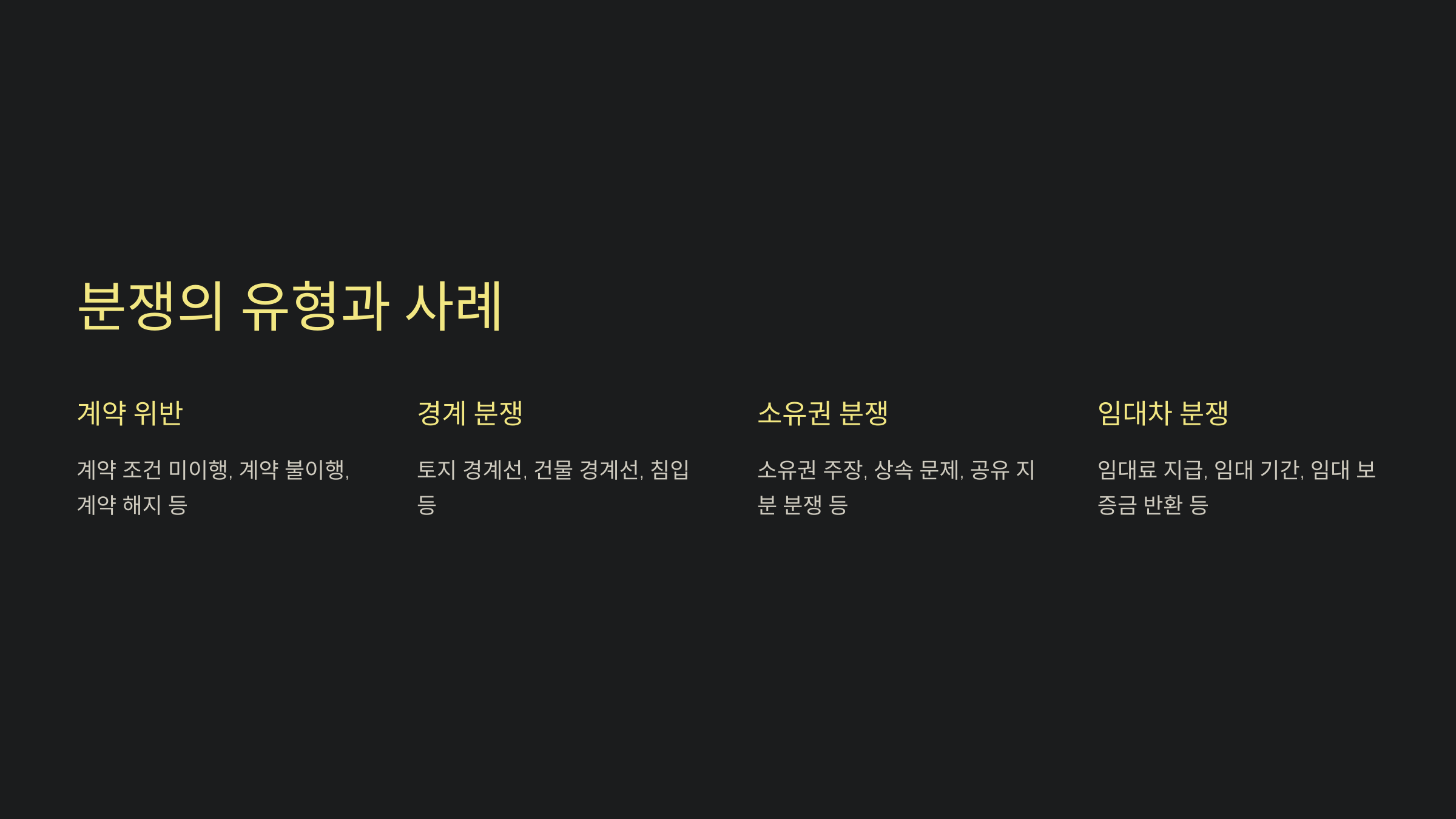 셋째, 부동산 거래와 관련된 분쟁도 많아요. 예를 들어, 주택을 구입한 후에 발견된 하자가 큰 문제로 이어질 수 있어요. 계약 시점에 매도인이 해당 하자를 알렸는지 여부가 분쟁의 핵심이 될 때가 많답니다.