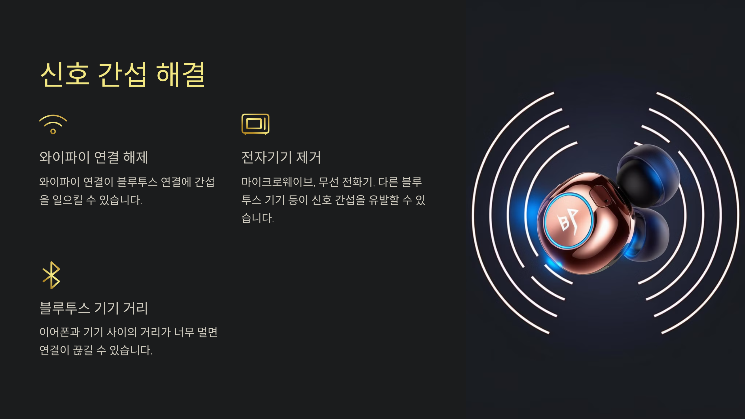 이어폰의 신호 강도가 약해지거나 연결이 자주 끊기면, 이어폰을 초기화하고 다시 페어링을 설정해보세요. 최신 블루투스 기술을 사용하는 이어폰이나 기기는 간섭 문제를 덜 겪는 경향이 있으니, 오래된 기기를 업그레이드하는 것도 고려해볼 만해요.