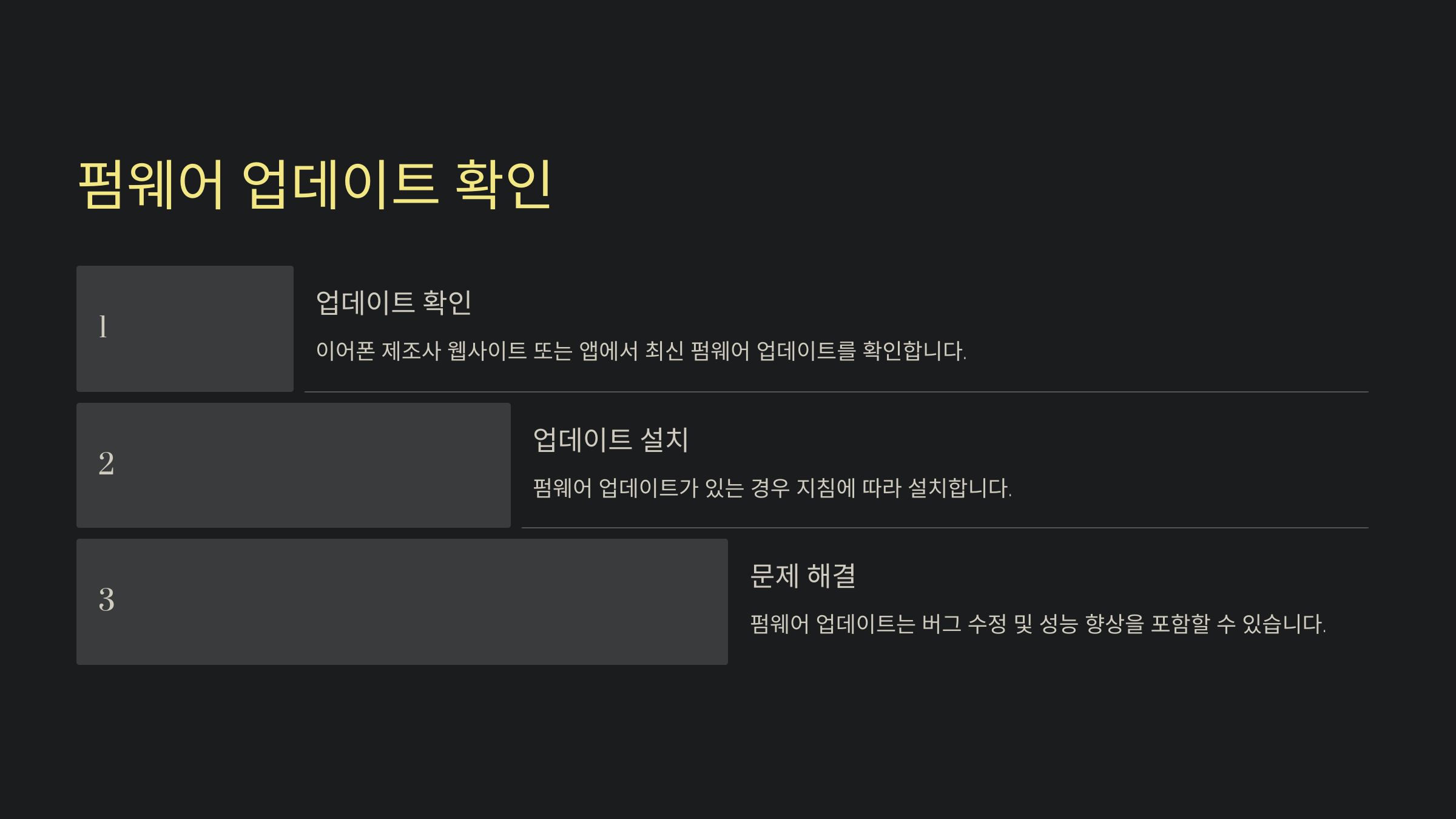 제조사에서 제공하는 전용 앱을 통해 펌웨어 업데이트를 진행할 수 있어요. 앱에서 업데이트가 가능하지 않다면, 이어폰의 사용자 설명서를 참고하거나 제조사 웹사이트를 방문해 업데이트 방법을 찾아보세요.