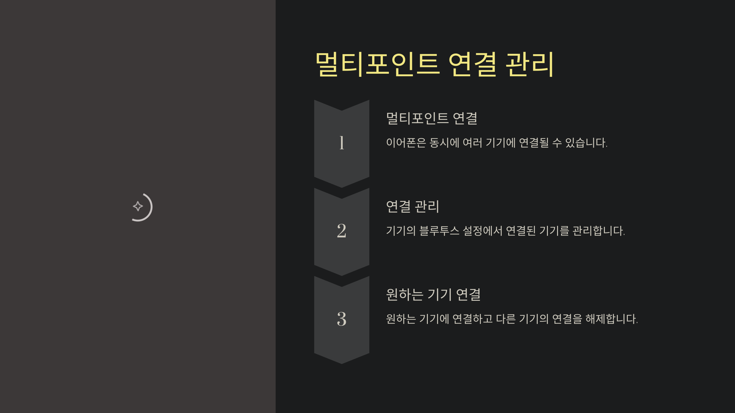 멀티포인트 기능을 사용 중에 연결 오류가 발생하면, 필요하지 않은 기기를 연결 해제하고 한 기기만 연결한 상태에서 사용해보세요. 이렇게 하면 연결 안정성이 훨씬 좋아질 거예요.