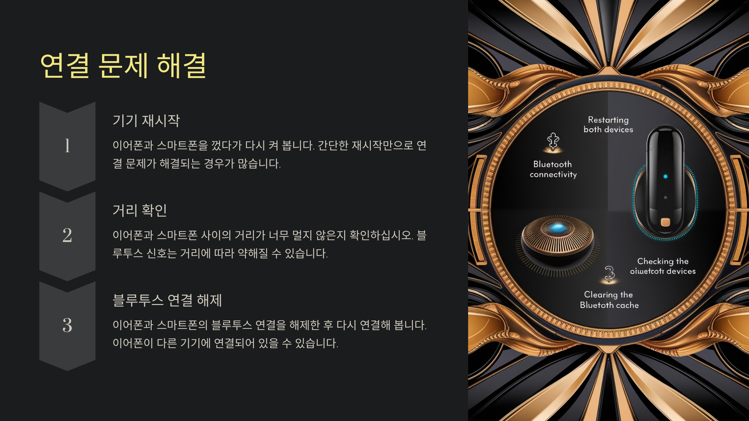 위의 방법들로도 해결되지 않는다면, 이어폰 매뉴얼에 있는 공장 초기화 방법을 참고하거나 제조사 고객센터에 문의하는 것도 하나의 방법이에요. 이런 과정을 통해 대부분의 연결 문제는 해결될 수 있답니다.