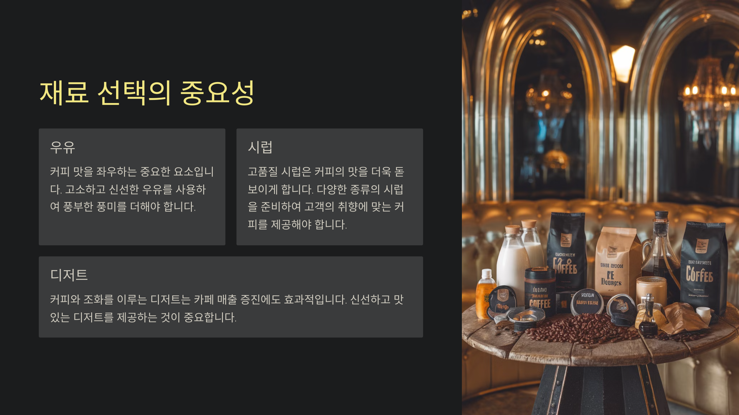 커피 외에 사용되는 재료도 음료의 맛과 품질에 큰 영향을 미쳐요. 예를 들어, 우유나 크림은 라떼와 같은 음료에서 중요한 역할을 해요. 일반 우유 외에도 아몬드 밀크, 오트 밀크 등을 제공하면 다양한 고객층을 공략할 수 있어요.