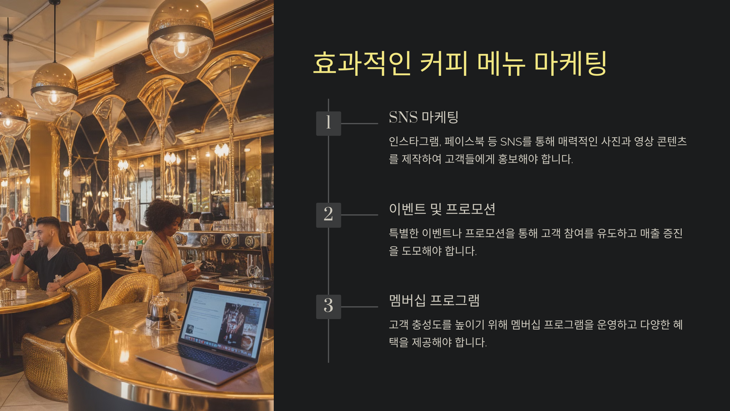 아무리 좋은 메뉴를 개발해도 이를 알리지 않으면 소비자들에게 다가가기 어려워요. 효과적인 마케팅 전략은 성공적인 커피 메뉴의 필수 요소예요. 우선, 메뉴의 스토리를 만들고 이를 강조하는 것이 중요해요. 예를 들어, 특정 원두의 산지나 특별한 재료의 유래를 소개해 보세요.