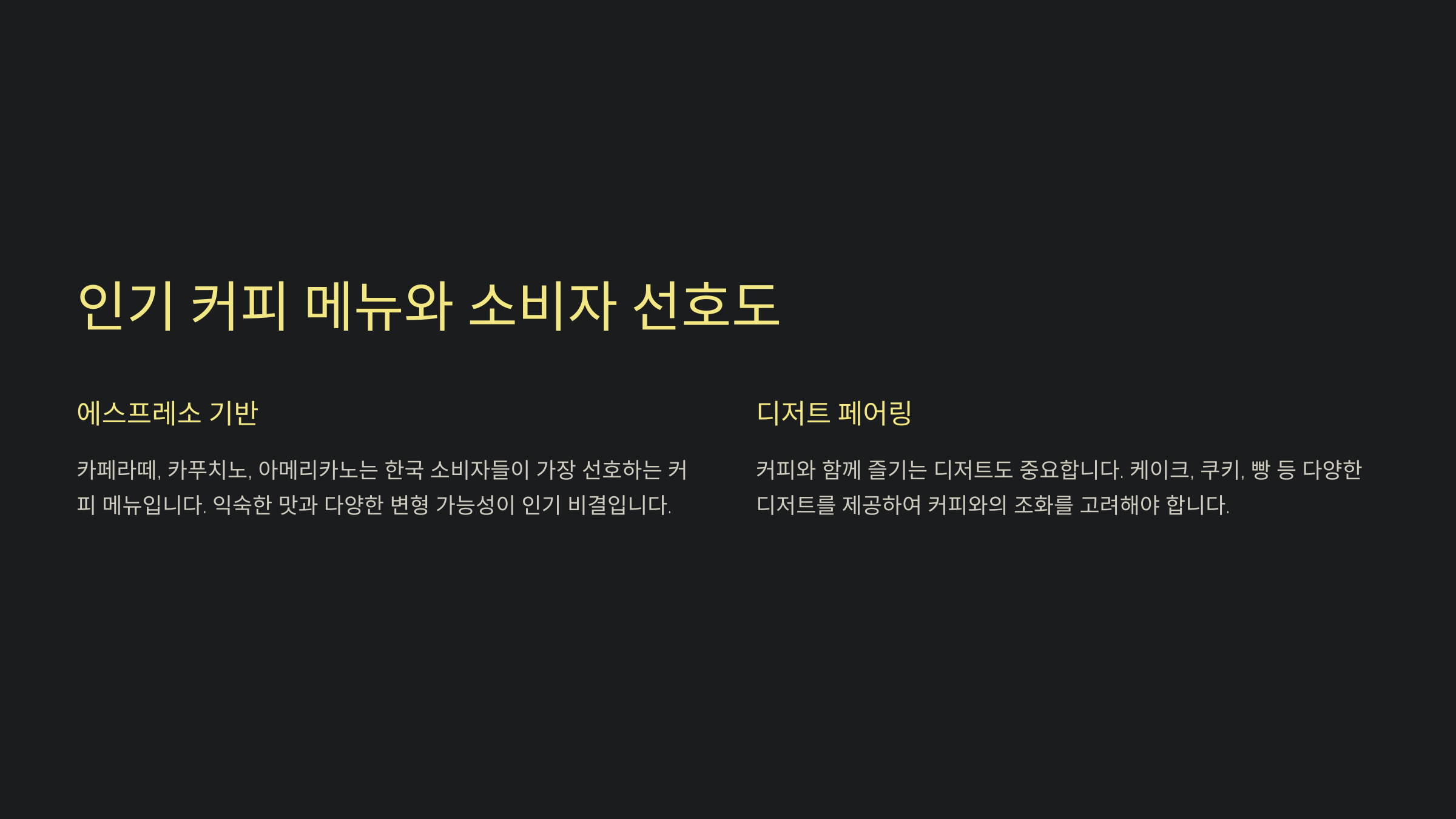 한편, 지역마다 선호도는 조금씩 달라요. 예를 들어 한국에서는 달콤한 바닐라 라떼나 아이스 음료가 특히 인기가 많지만, 유럽에서는 에스프레소처럼 진하고 깔끔한 커피를 선호하는 경향이 있어요. 이러한 소비자 취향은 메뉴 구성 시 반드시 반영해야 할 부분이에요.