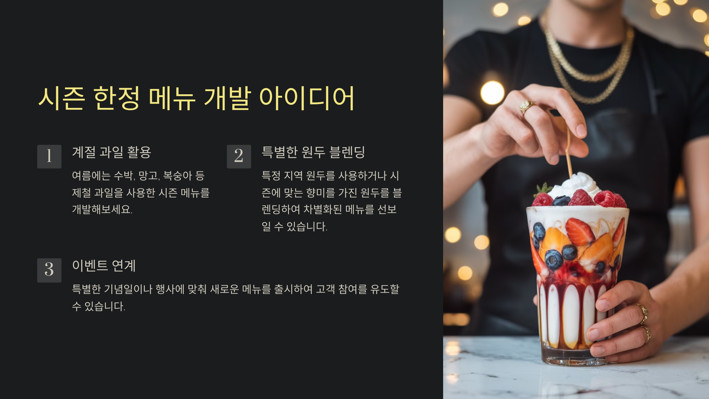 계절에 따라 메뉴를 업데이트하는 것은 소비자에게 신선한 인상을 줄 수 있는 좋은 방법이에요. 예를 들어, 여름에는 시원한 콜드 브루나 복숭아 아이스 티 같은 메뉴가, 겨울에는 따뜻한 초콜릿 라떼나 계피 향이 가미된 음료가 인기랍니다.
