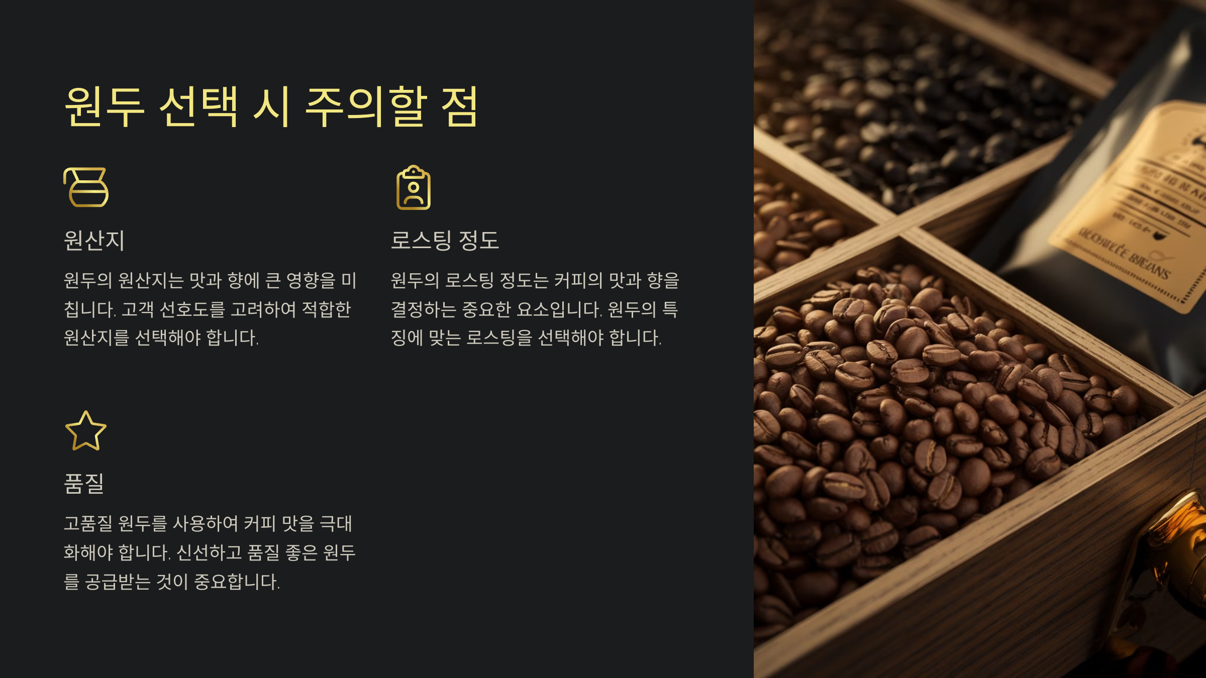 또한 로스팅 정도도 중요해요. 라이트 로스팅은 산미가 강조되고, 다크 로스팅은 쓴맛과 강렬한 풍미가 더해져요. 메뉴 성격에 맞는 로스팅을 선택하면 커피의 맛과 개성을 더 잘 살릴 수 있어요.