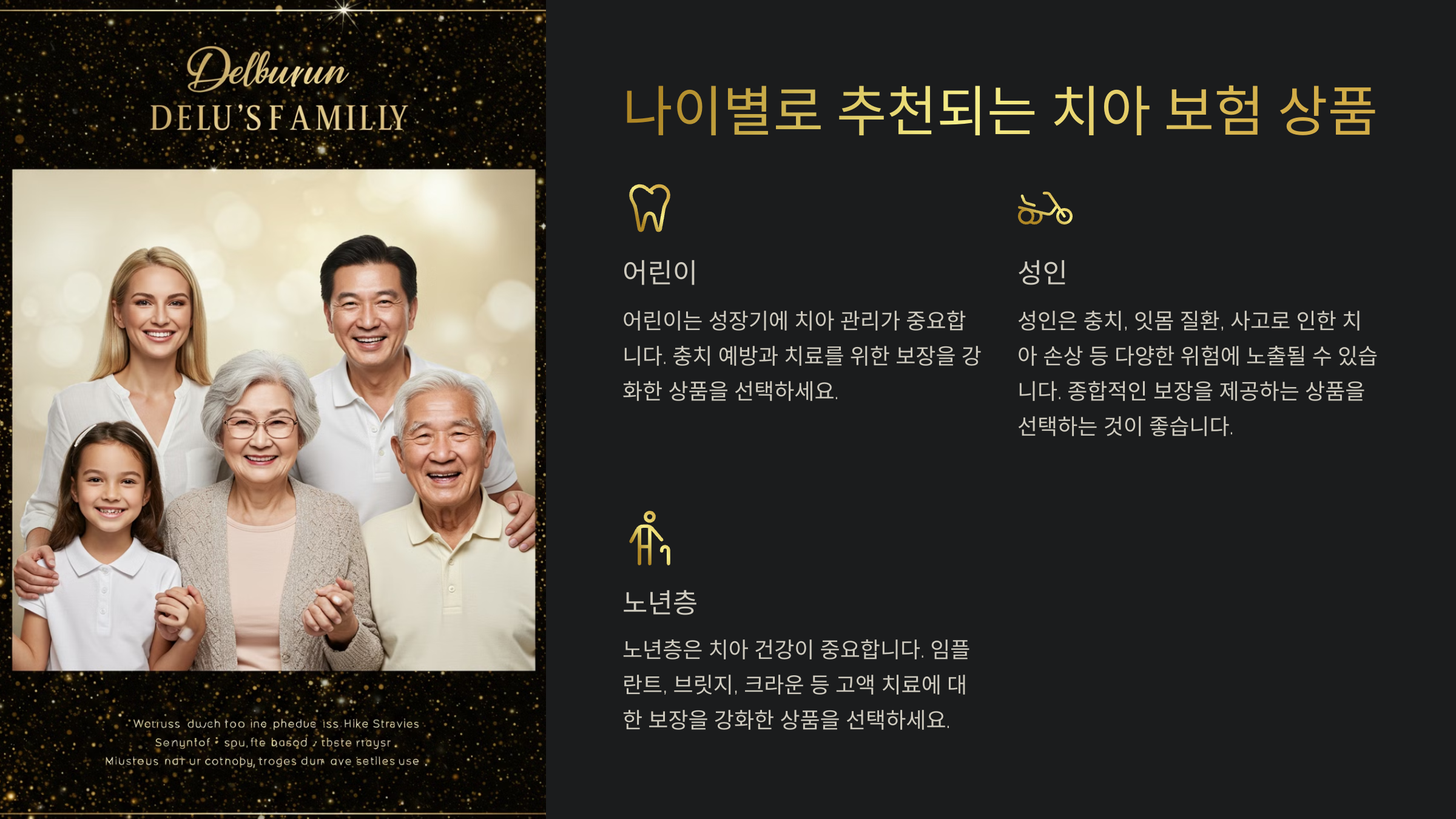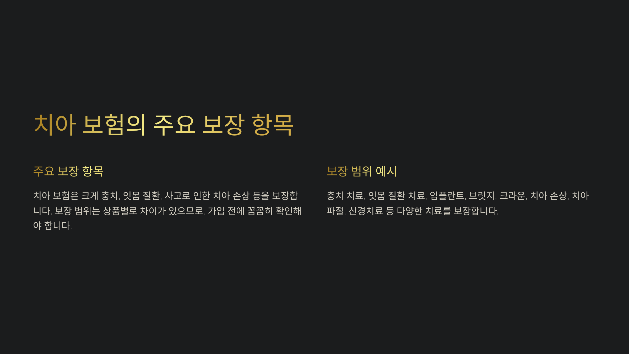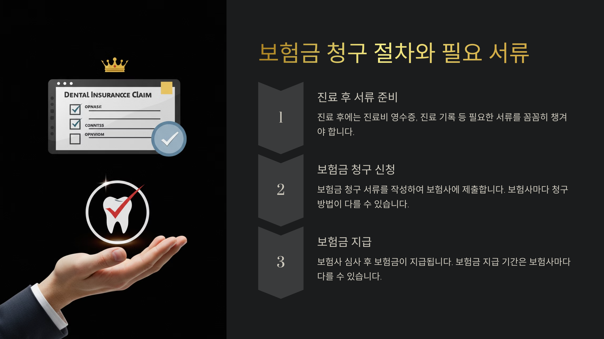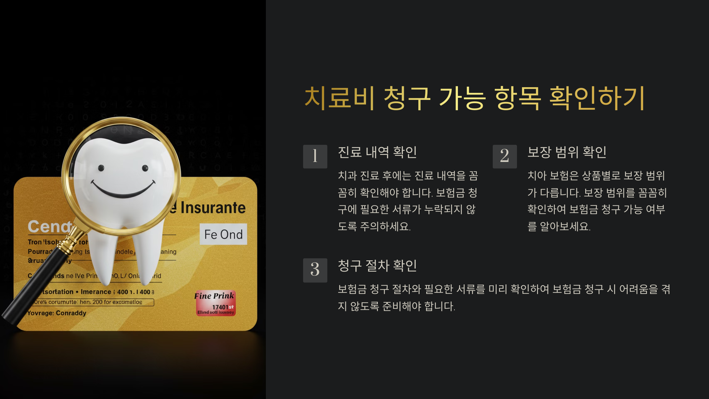 계속해서 청구 가능한 치료비 항목, 연령별 추천 치아 보험 등 나머지 섹션이 곧 이어집니다!