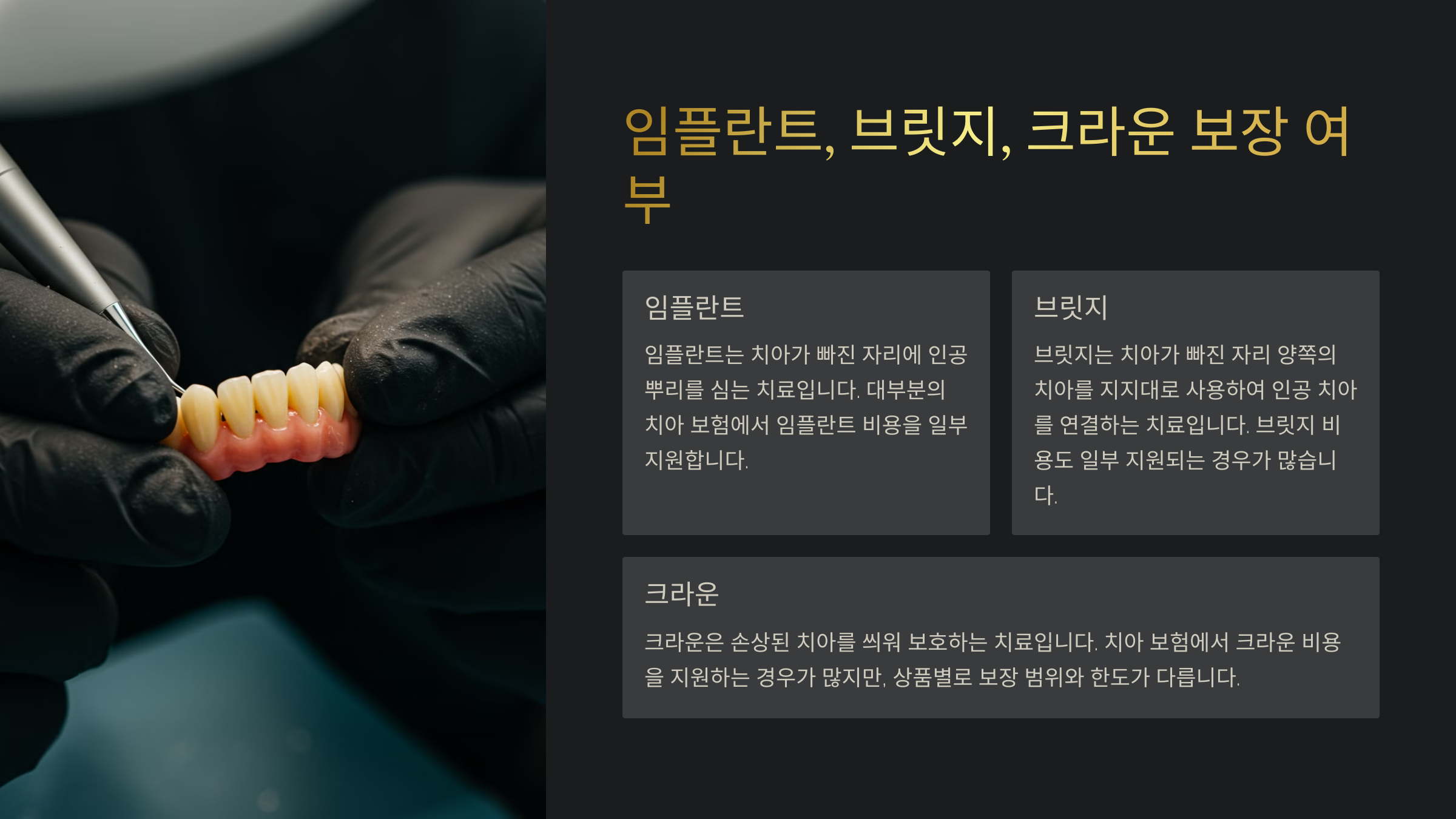 임플란트, 브릿지, 크라운은 치아 보험 가입자들이 가장 많이 관심을 가지는 치료 항목이에요. 이 치료들은 보철 치료의 일부로 간주되며, 각 보험 상품별로 보장 한도가 다르게 설정되어 있어요.