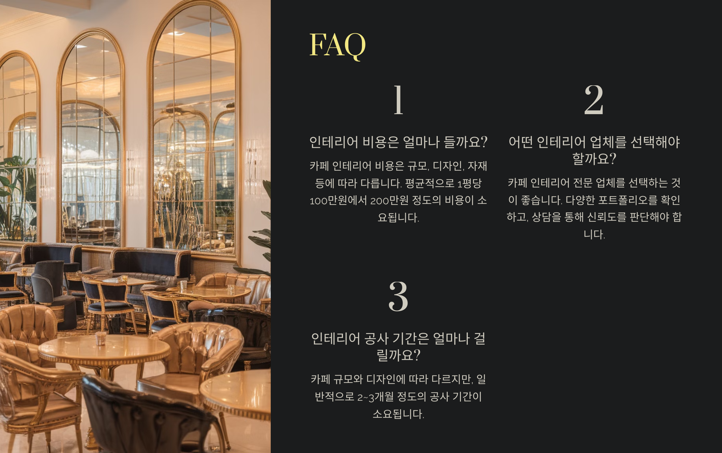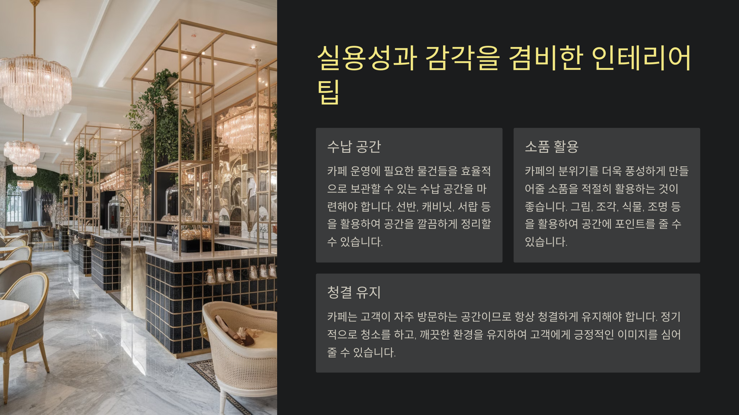 카페 인테리어는 실용성과 감각 모두를 고려해야 해요. 단순히 보기 좋은 공간을 넘어, 고객과 직원 모두가 편리함을 느낄 수 있는 환경을 만들어야 하죠.