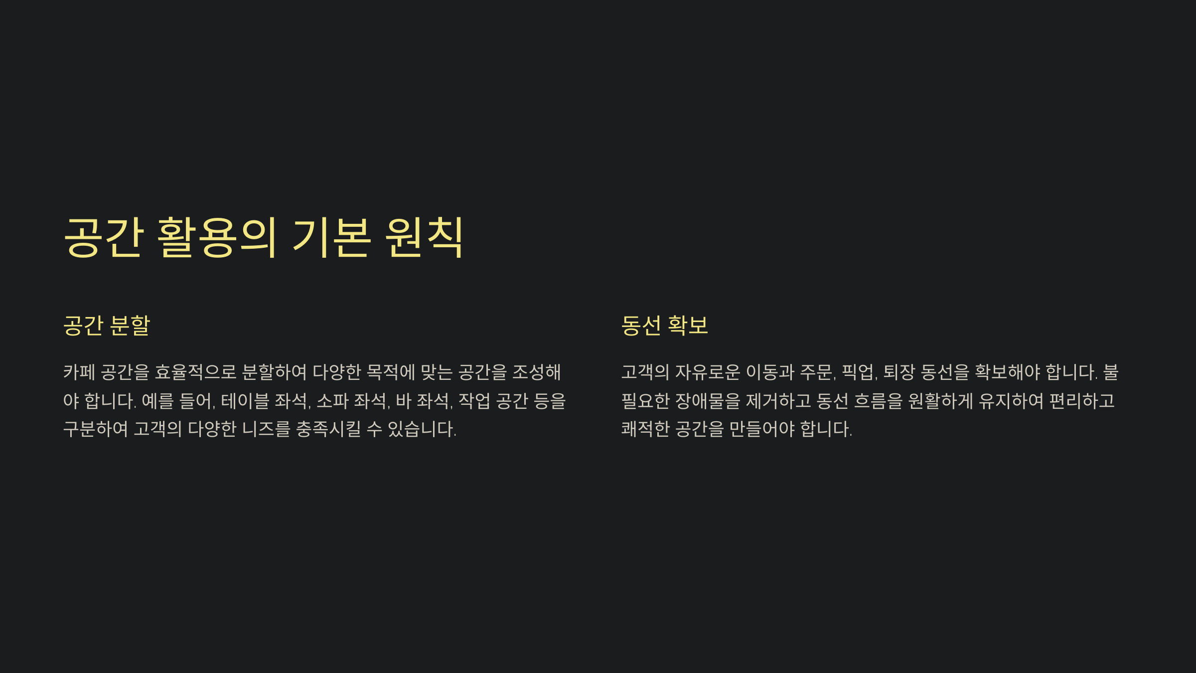 먼저, 동선을 고려해 지나치게 좁은 통로나 막다른 공간이 없도록 설계해야 해요. 고객이 매장에 들어오고 주문한 후 편하게 자리를 찾을 수 있도록 동선을 설계하면 공간이 훨씬 더 효율적으로 보이죠.