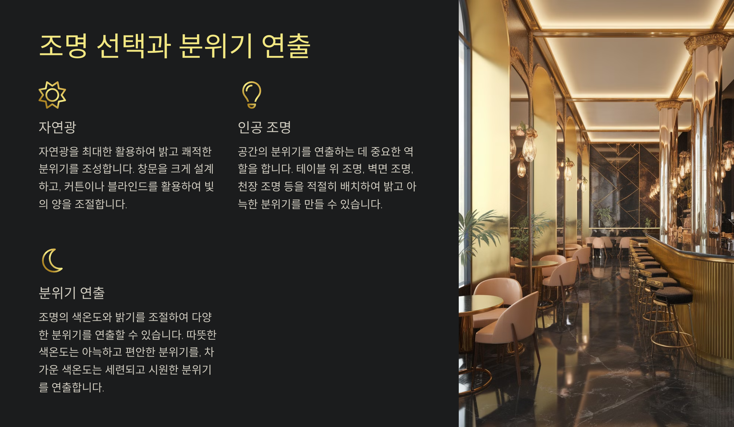 A3. 조명은 색온도와 배치가 중요해요. 따뜻한 조명을 사용해 아늑한 분위기를 만들고, 포인트 조명으로 메뉴판이나 아트워크를 강조하면 공간이 더 생동감 있게 느껴질 거예요.