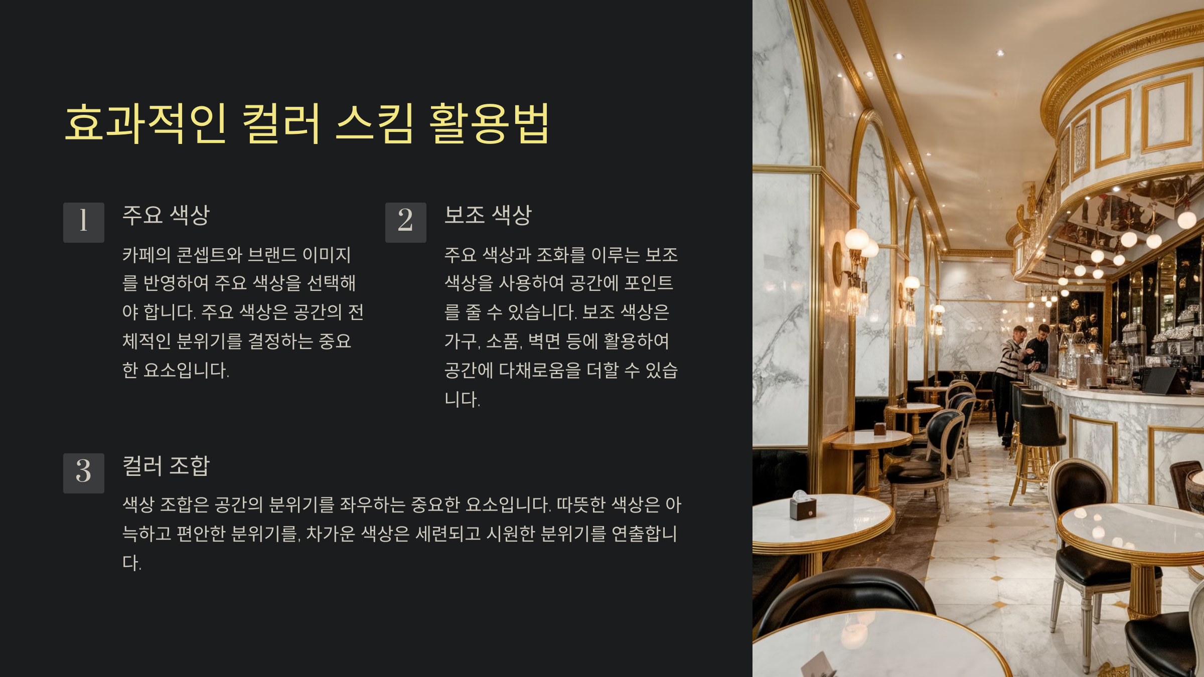 컬러 스킴은 카페의 정체성을 강화하고, 고객이 느끼는 분위기에 직접적인 영향을 줘요. 잘 선택된 색상은 고객의 감정과 행동에도 영향을 미칠 수 있답니다.