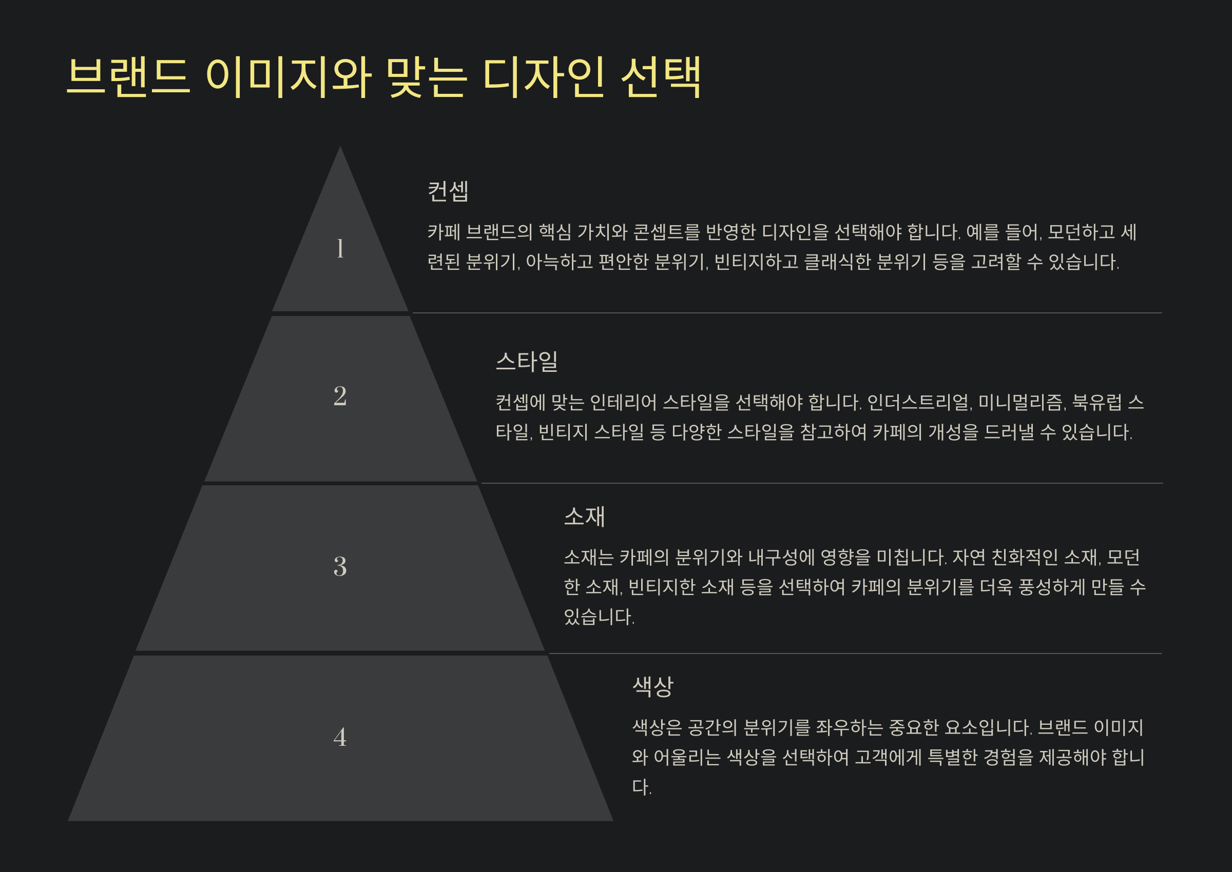 카페 인테리어는 브랜드 이미지와 반드시 일치해야 해요. 매장의 디자인은 고객이 브랜드를 처음 접할 때 느끼는 첫인상이기 때문에, 브랜드 정체성을 명확하게 표현할 수 있어야 해요.