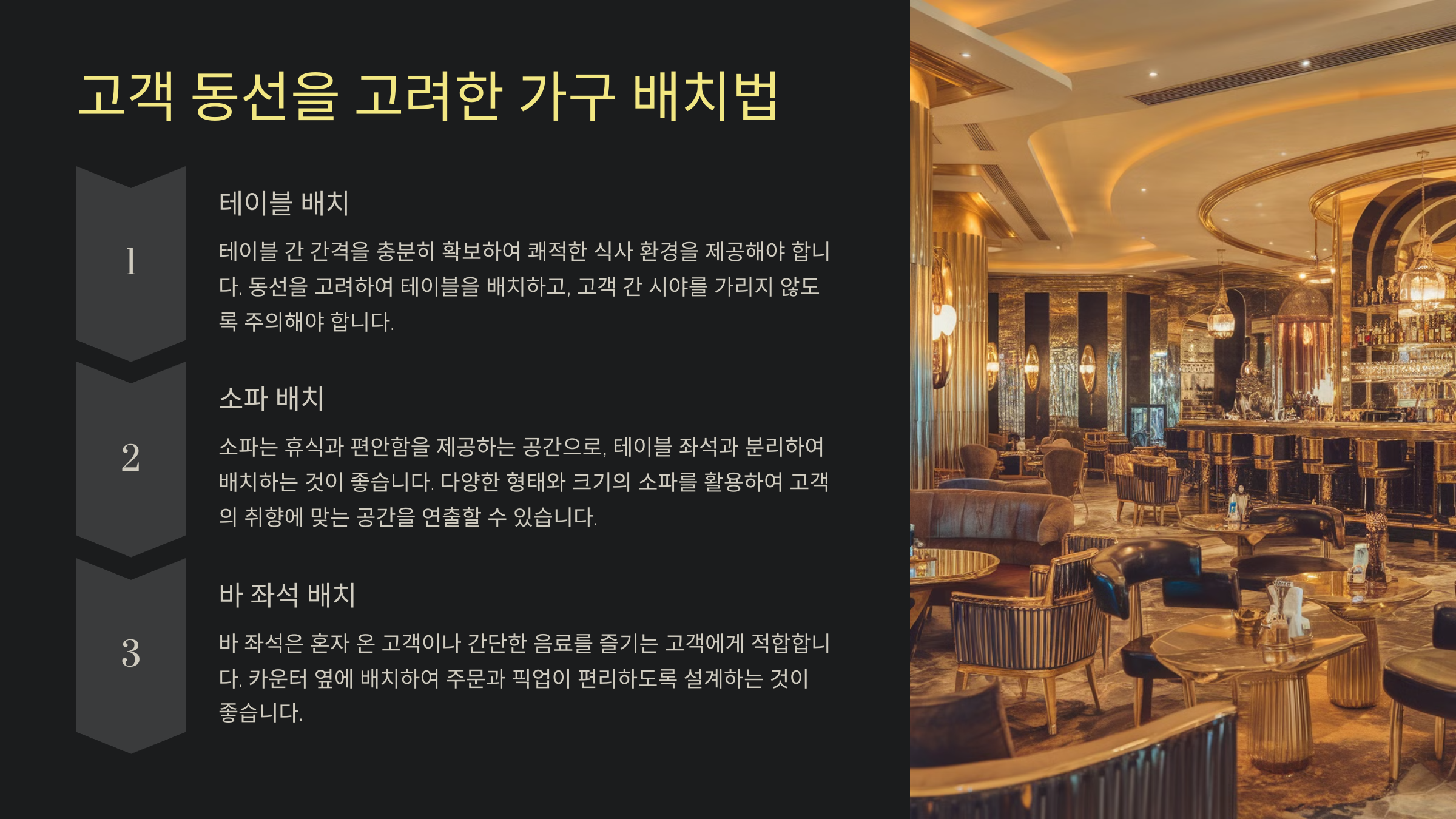 또한, 창가 쪽에는 바 테이블이나 1인용 좌석을 배치해 혼자 방문하는 고객이 머물기 좋은 환경을 조성할 수 있어요. 대형 테이블은 그룹 고객을 위한 공간으로 활용하면 좋아요. 다양한 좌석 구성을 통해 모든 고객이 편안함을 느낄 수 있도록 배려해 보세요.