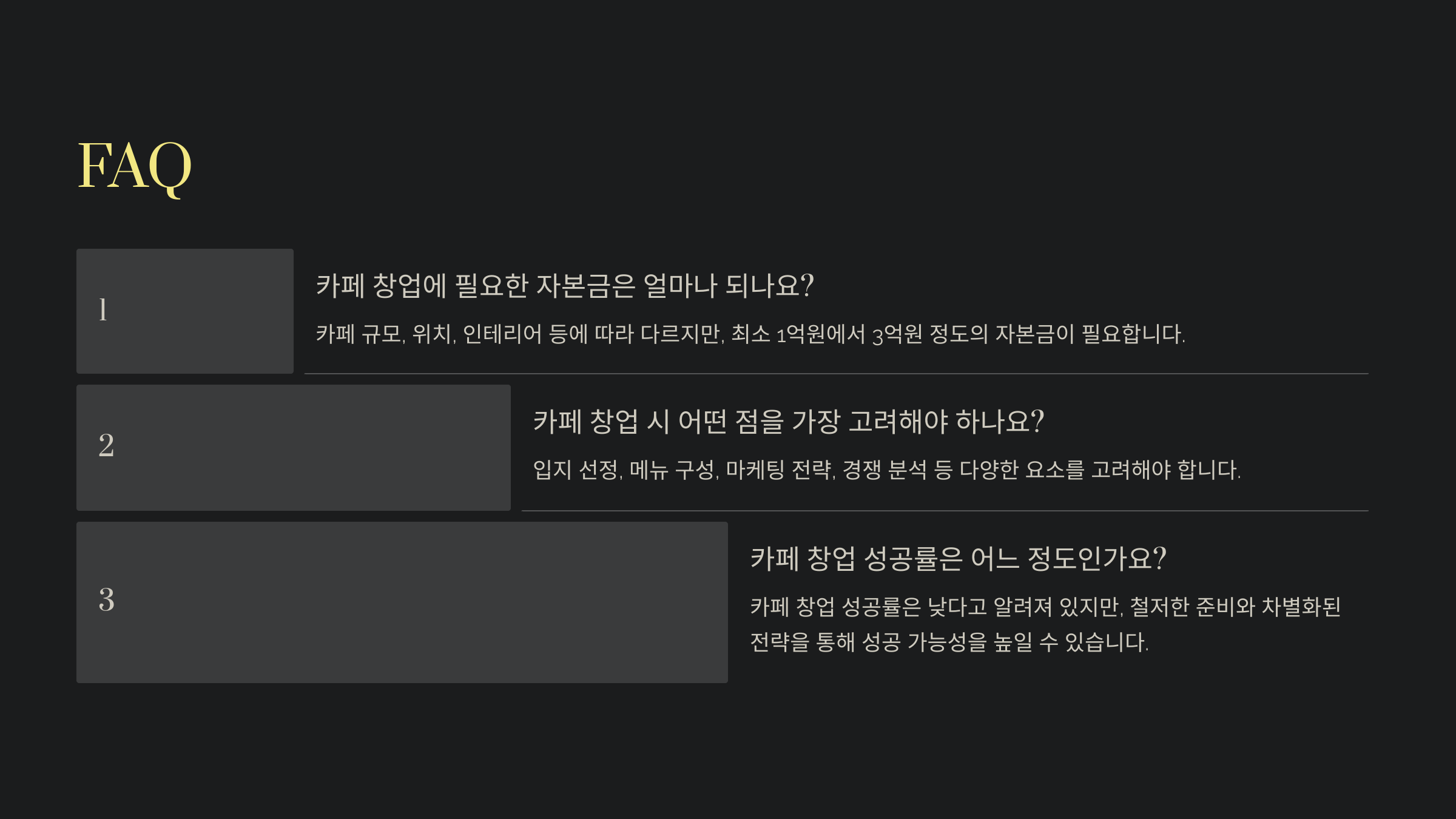 A1. 보통 소형 카페는 5,000만 원에서 1억 원 정도, 중대형 카페는 2억 원 이상이 필요해요.